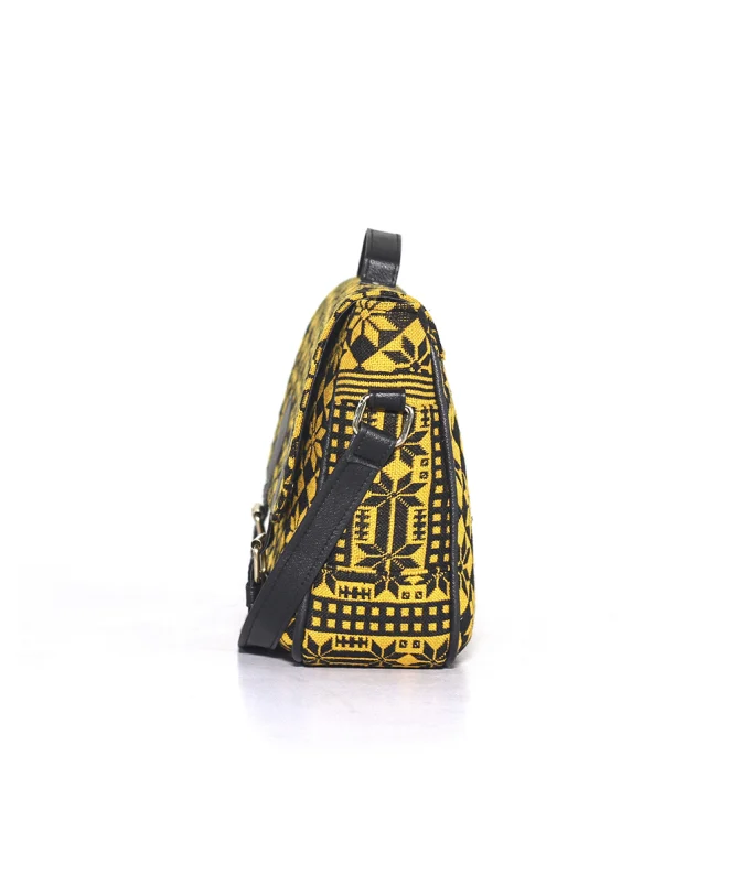 The design of this bag is crafted with a yellow and black pattern combined with the finest quality of artificial black leather. This bag will be your perfect travel partner.Comes with a two buckle front flap.A handle on the top to carry. An adjustable strap.The inside of the bag contains two open pockets and a zipped pocket.A separate pocket is on the back of the bag under the flap. Dimensions: Length * Width * Height: 13 * 4 * 9 inches.